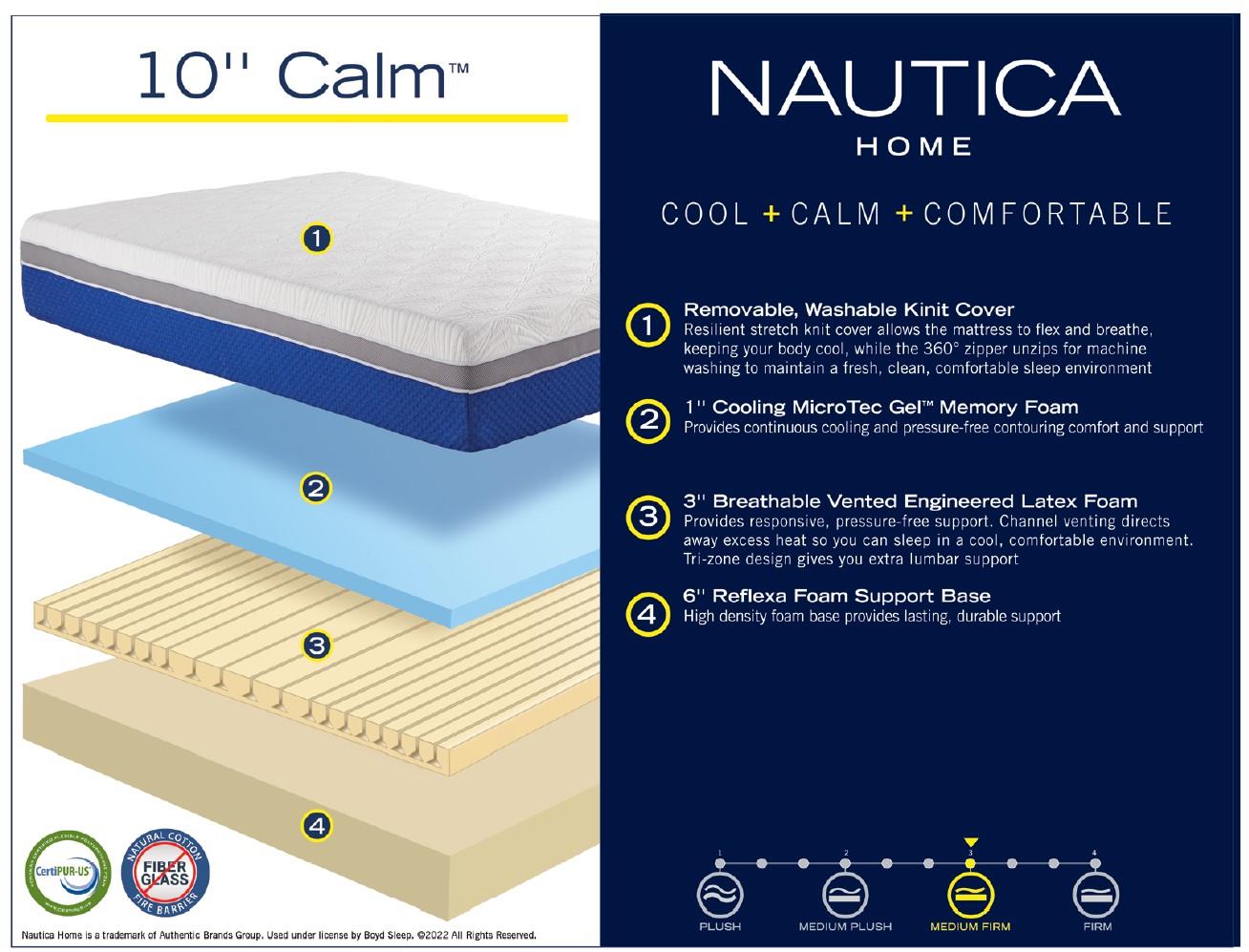 Thoughtfully crafted with an unparalleled attention to detail, the Nautica Home Calm mattress provides the cooling and supremely soothing comfort that only Nautica Home can offer. Cooling liquid gel infused MicroTec Gel Memory Foam maintains continuous and pressure-free, body cradling support allowing you take way up feeling refreshed and rejuvenated night after night. Channel vented for maximum thermal control and cooling, an advanced layer of high-performance latex engineered foam offers the responsiveness of latex with the calming and contouring, yet elegant feel of cooling liquid gel. An ultra-firm, patented foam tray design surrounds the entire circumference of the mattress, increasing the overall sleep surface and preventing edge sag. The foam perimeter sits directly under the upper comfort layers to add additional edge support while still remaining remarkably comfortable. All Nautica memory foam mattresses rest atop a tri-zone, channel vented Foam Spring support base that increases contouring to your body and provides the healthy lumbar support your body needs to reduce lower back pain. Strategically positioned to offer the maximum support and allow for additional cooling comfort, the channel vented design increases horizontal air flow to keep you and your mattress feeling fresh. Simple and easy to remove, the 360 degree zipper allows the stretch knit cover to be machine washed for a fresh, clean and comfortable sleep environment.