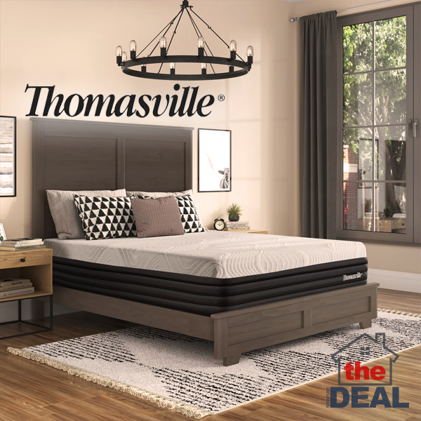Thomasville Plymouth 12.5″ Gel Memory Foam Hybrid Mattress – Made in the USA. Medium plush feel with cooling gel memory foam, pocketed springs, and breathable knit cover for soft, supportive comfort. CertiPUR-US certified, fiberglass free, and mattress-in-a-box for easy setup.